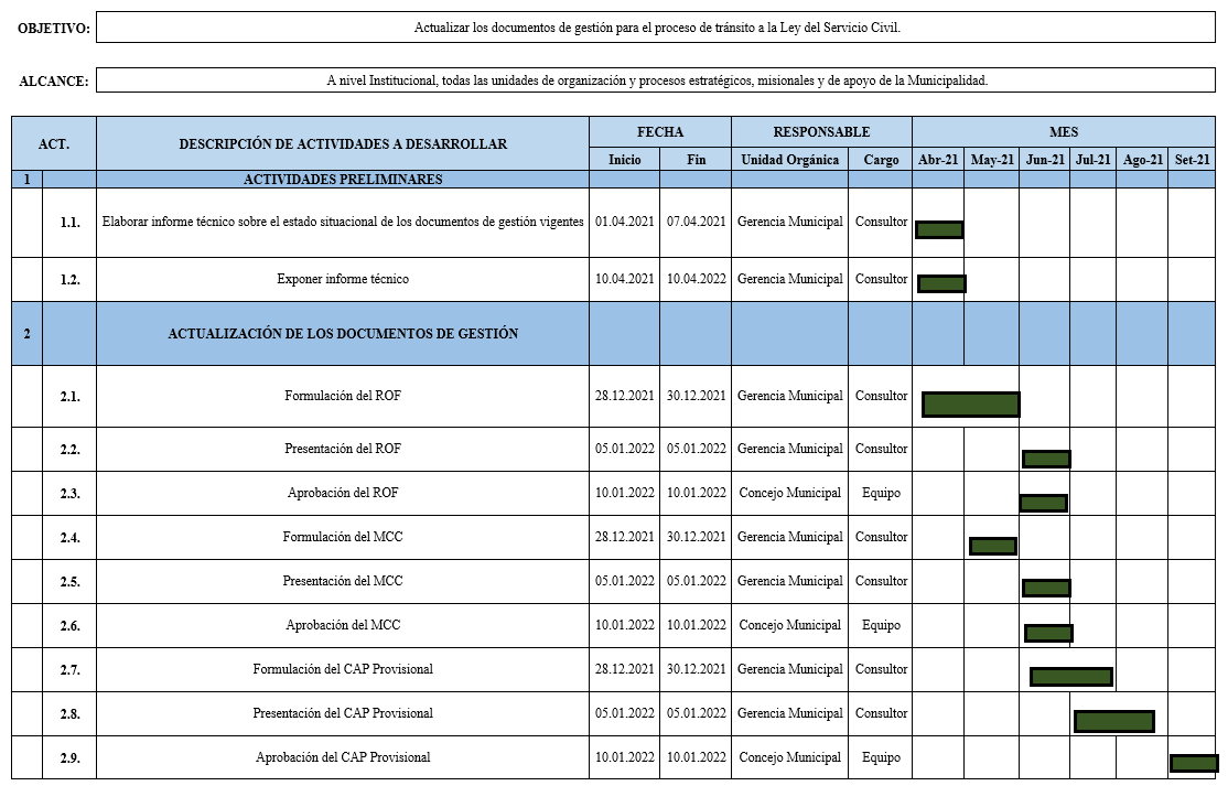 El consultor presento un Plan de Trabajo con el objetivo actualizar los documentos de gestión de la Municipalidad Distrital de Paucara (Reglamento de Organización y Funciones, Cuadro Para Asignación de Personal Provisional, Manual de Clasificador de Cargos y Presupuesto Analítico de Personal) realizar el proceso de tránsito al Servicio Civil, y mejorar la organización de la municipalidad a acorde la Política Nacional de Modernización de la Gestión Pública. También justificando que según Ley Nº 27658 - Ley Marco de Modernización de la Gestión del Estado, declara al Estado peruano en proceso de modernización en sus diferentes instancias, dependencias, entidades, organizaciones y procedimientos, con la finalidad de mejorar la gestión pública y construir un Estado democrático, descentralizado y al servicio del ciudadano; el artículo 47 de la Ley Nº 29158 - Ley Orgánica del Poder Ejecutivo, dispone que los entes rectores de los sistemas administrativos tienen las siguientes competencias o funciones: (i) programar, dirigir, coordinar, supervisar y evaluar la gestión del proceso, (ii) expedir las normas reglamentarias que regulan el Sistema, (iii) mantener actualizada y sistematizada la normatividad del Sistema, (iv) emitir opinión vinculante sobre la materia del Sistema, (v) capacitar y difundir la normatividad del Sistema en la Administración Pública, (vi) llevar registros y producir información relevante de manera actualizada y oportuna, (vii) supervisar y dar seguimiento a la aplicación de la normatividad de los procesos técnicos de los Sistemas, (viii) promover el perfeccionamiento y simplificación permanente de los procesos técnicos del Sistema Administrativo; y, (ix) las demás que señalen las leyes correspondientes.