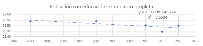 En el comportamiento con educación secundaria completa, en el año 2003 la población con educación secundaria completa fue 29,54% y en el año 2012 se ha registrado un valor de 29,50%, habiéndose mantenido en el puesto 1304 en el ranking nacional de todos los distritos del Perú. El valor proyectado esperado de la población con educación secundaria completa para el año 2015 fue 29,36% inferior al valor 29,50% registrado en el año 2010 (Figura 5).