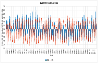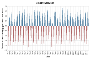 Los episodios ocurridos de sequía fueron de 24, 66, 145 eventos de categoría extremadamente seco, severamente seco y moderadamente seco para la subcuenca Chancos para los índices estandarizados.