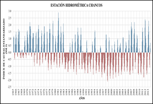 En la figura (1) se muestra la estación hidrométrica Chancos, por lo que se supone que los datos de esta estación se relacionan con las precipitaciones en la parte superior de la subcuenca Chancos, según el concepto de la relación lluvia-escurrimiento. De manera que es adecuado para el análisis de comparación entre los índices de sequías meteorológicos e hidrológicos. En este trabajo se han utilizado las series de caudales mensuales para el período 1965 – 2013.