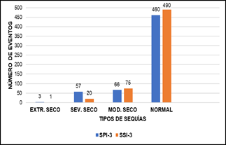 Figura 8. Comparación entre la cantidad de eventos de sequía entre el SSI-3 y el SPI-3.